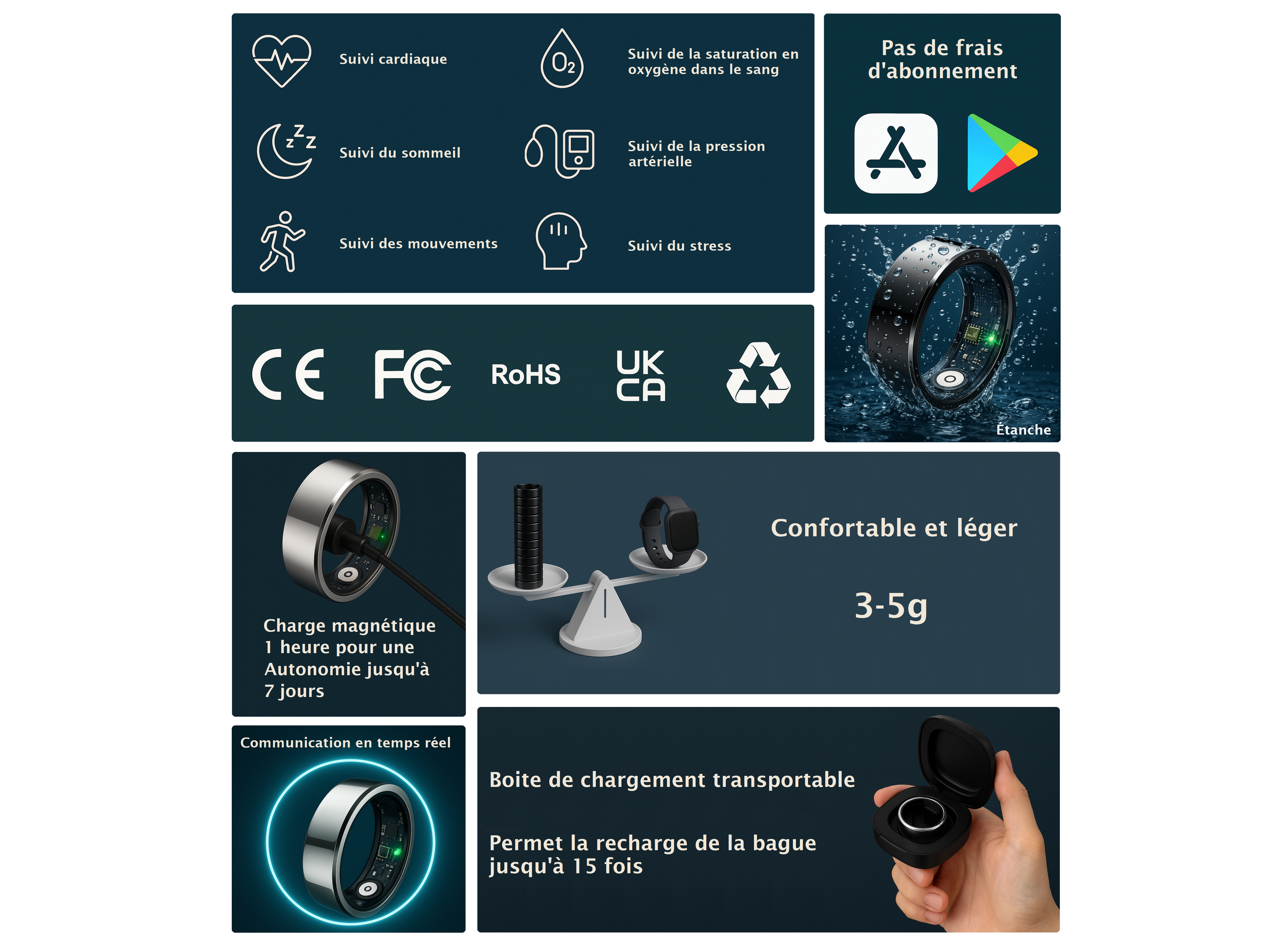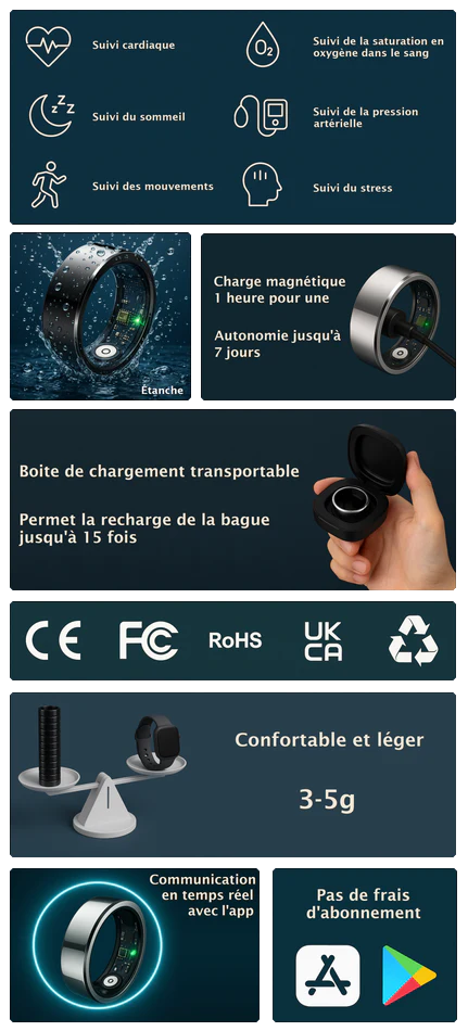 Les bagues connectées offrent une mesure plus précise de la fréquence cardiaque grâce au pouls digital, plus stable qu’au poignet. Elles permettent un suivi complet du bien-être : sommeil, activité physique, saturation en oxygène, stress. Compactes, discrètes et personnalisables, elles allient performance, confort et élégance, sans l’encombrement d’une montre connectée.
