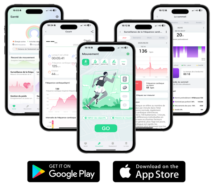 Grâce à l'application dédiée, accédez à toutes vos données de santé en temps réel : sommeil, fréquence cardiaque, oxygène sanguin, stress, activité physique…